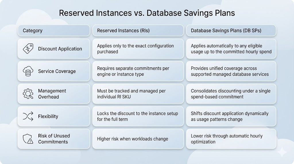 The shift from configuration-specific Reserved Instances to spend-based Database Savings Plans introduces several meaningful changes in how AWS applies discounts to managed database workloads. While Reserved Instances are tied to a specific engine, instance family, and Region, Database Savings Plans evaluate eligible usage continuously and apply discounts wherever they provide the most value within the customer’s committed hourly spend.
