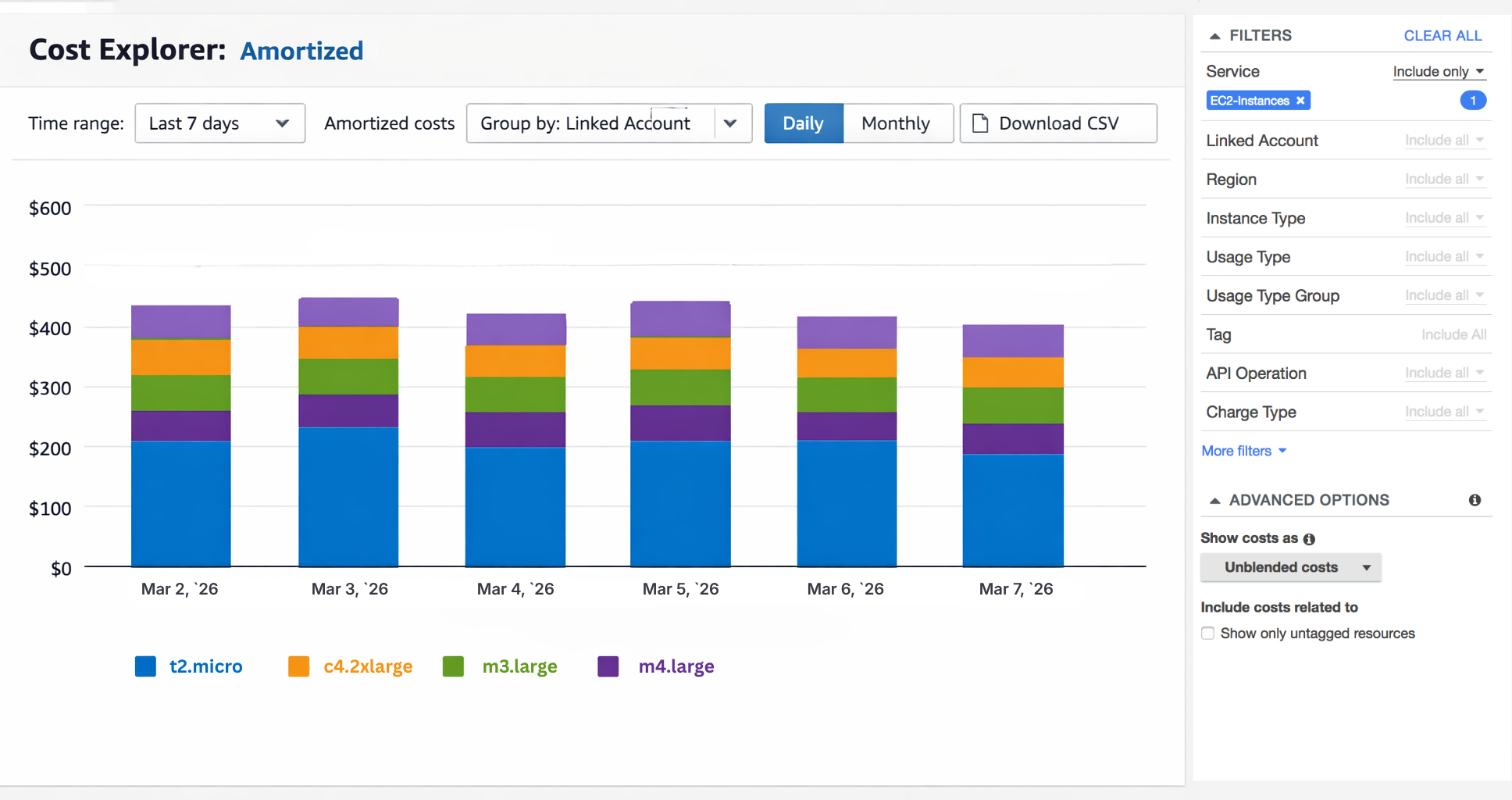 In the AWS Console, navigate to Billing & Cost Management → Cost Explorer. In the right-hand panel under Advanced Options, select Amortized costs from the cost type dropdown (the default is Unblended costs). The chart updates immediately. For multi-account analysis, group by Linked Account to see how amortized Savings Plan coverage distributes across your Organization.
