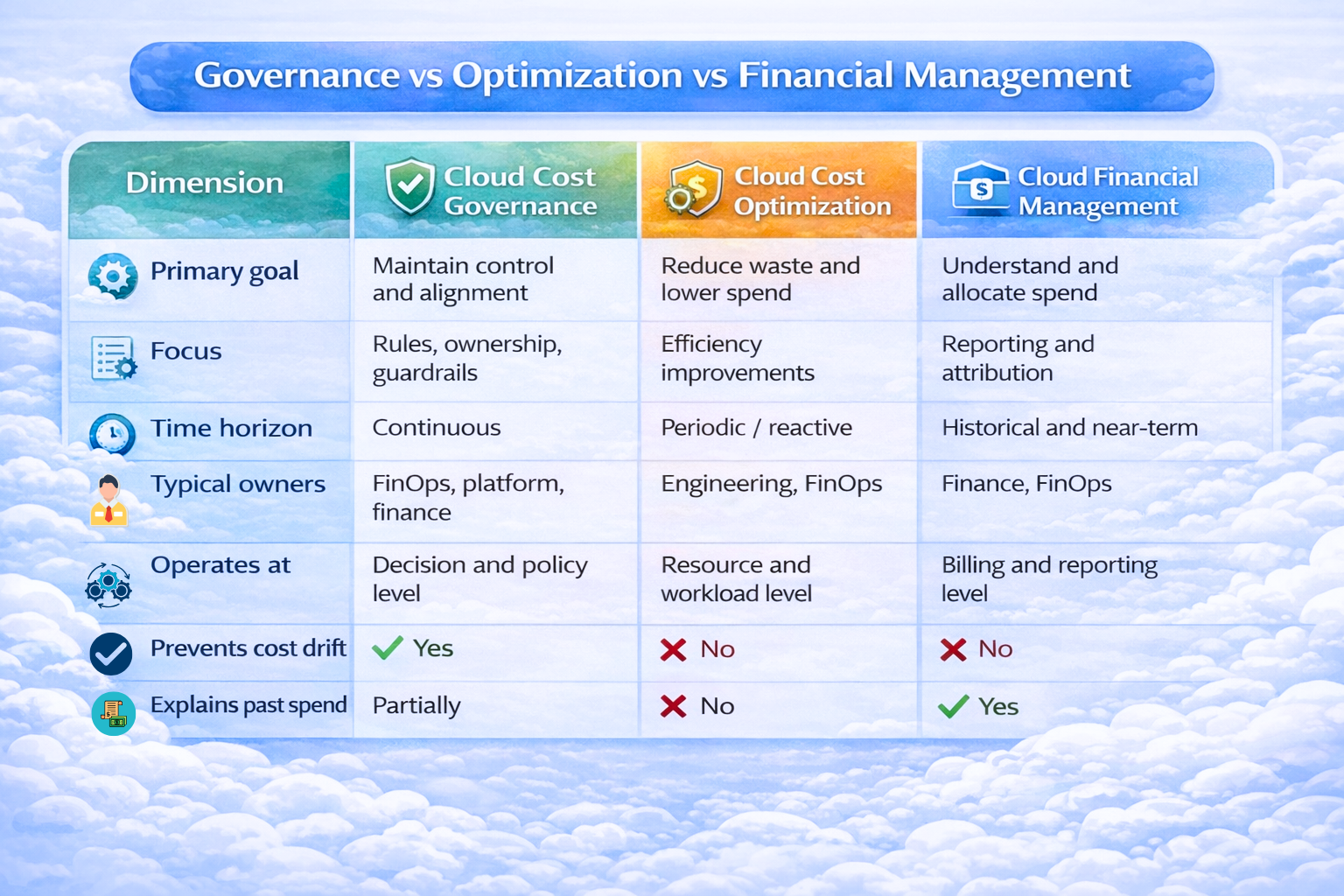 Cloud cost governance is often used interchangeably with cost optimization or cloud financial management. In practice, they solve different problems and operate on different timelines.