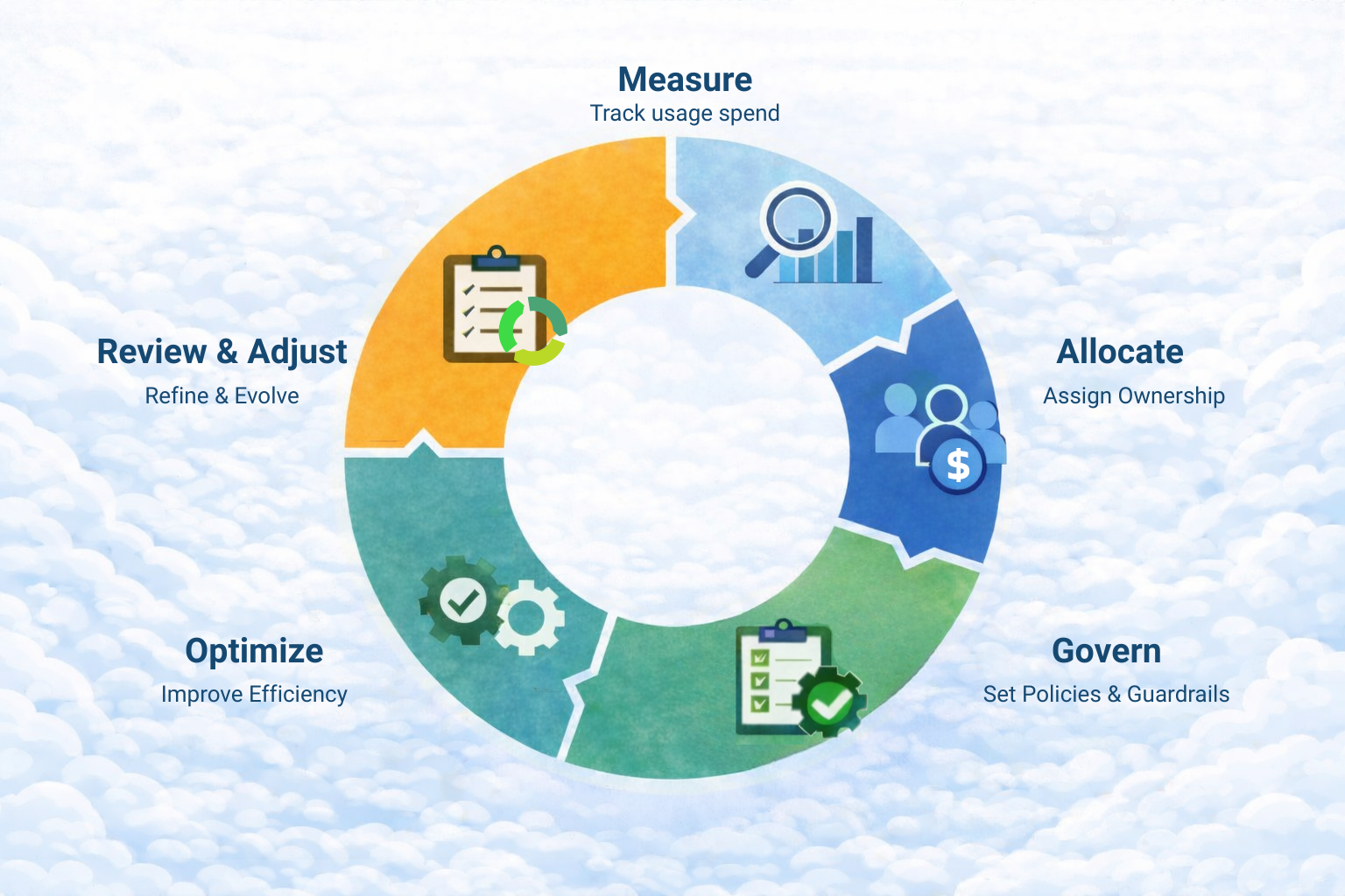 Cloud cost governance is a repeating loop that adapts as systems, teams, and usage patterns change. Organizations that struggle with governance often treat one part of the lifecycle as the whole thing, which is why controls decay over time.