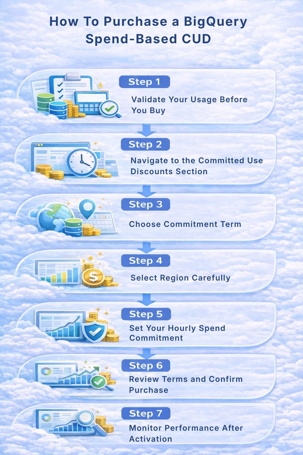You can purchase a BigQuery Committed Use Discount directly from the Google Cloud Console by selecting a region, commitment term, and hourly spend amount.